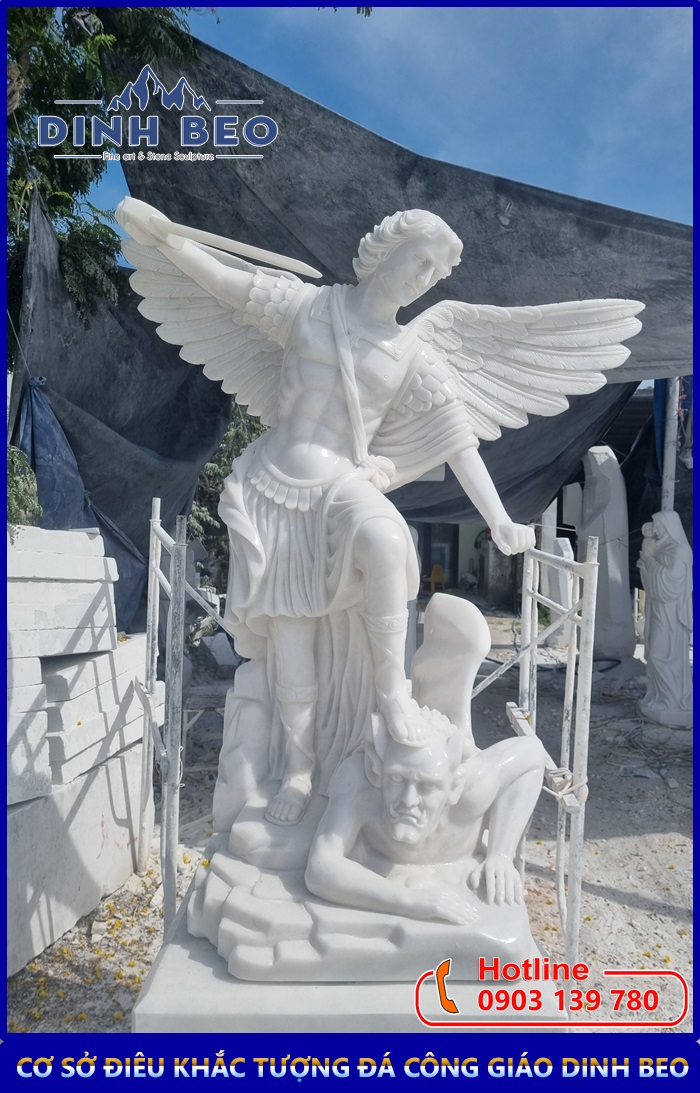 Điêu khắc từ đá tự nhiên nguyên khối cao cấp, tượng vừa trang nghiêm, tinh xảo, vừa bền vững theo thời gian, thích hợp cho nhà thờ, đài Tổng Lãnh Thiên Thần Micae, khuôn viên tu viện, hoặc sân vườn tâm linh.
