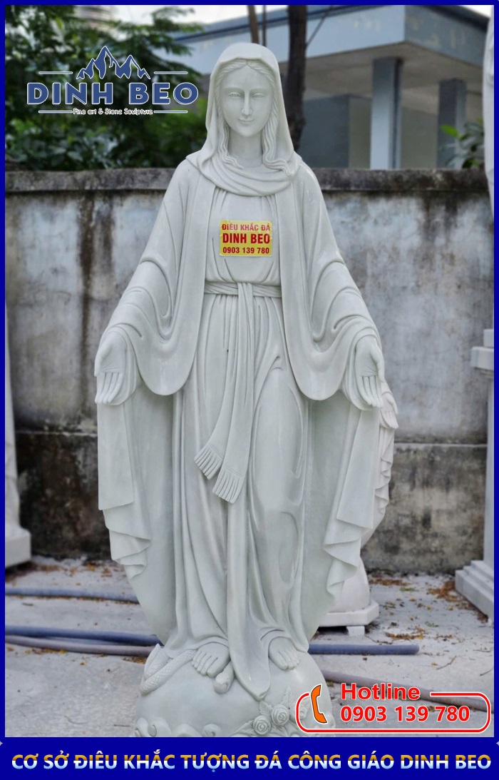 Tượng Đức Mẹ Ban Ơn bằng đá nguyên khối là hình ảnh quen thuộc trong Kitô giáo, thể hiện sự che chở, ban phúc và niềm tin vững bền. Mẹ Maria đứng trên quả địa cầu, tay dang rộng ban phúc, tượng trưng cho tình yêu thương và lòng nhân hậu của Thiên Chúa dành cho tín hữu.