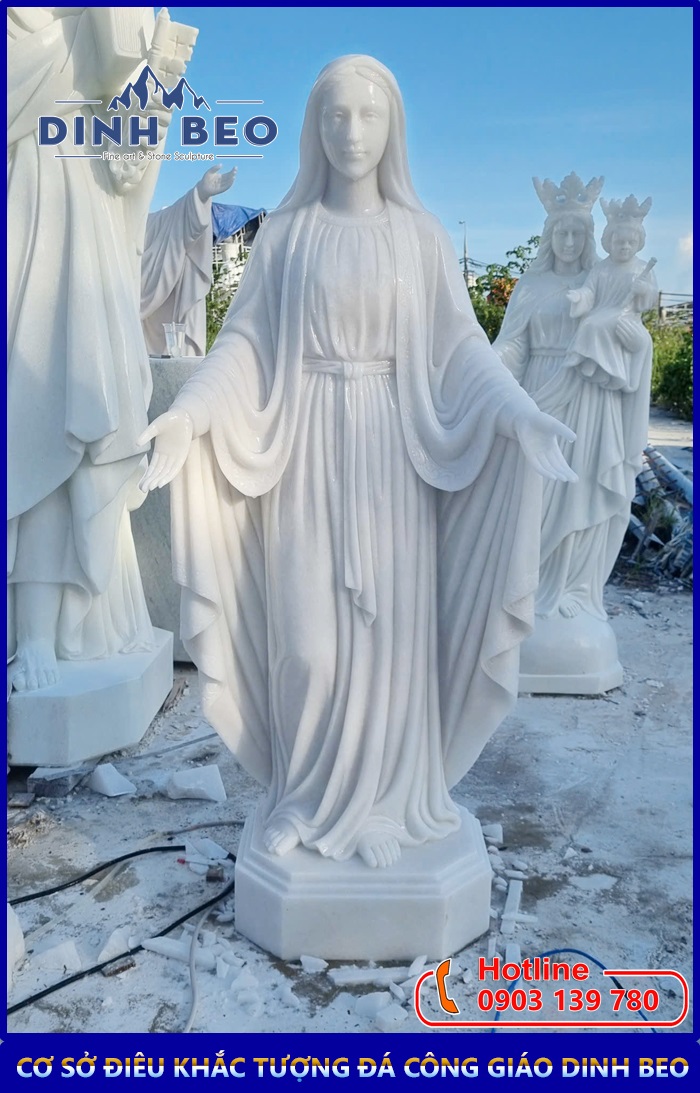 Tượng Đức Mẹ bằng đá cẩm thạch là biểu tượng của sự hiền từ, lòng nhân hậu, tình mẫu tử và niềm tin vững bền. Hình ảnh Mẹ Maria được điêu khắc tỉ mỉ, uy nghiêm, mang đến cảm giác bình an và thanh thản cho mọi tín hữu.